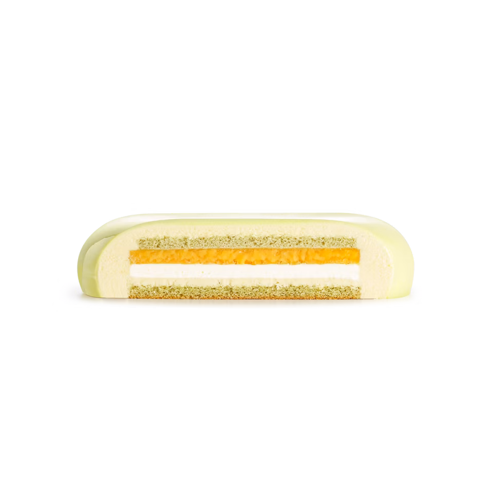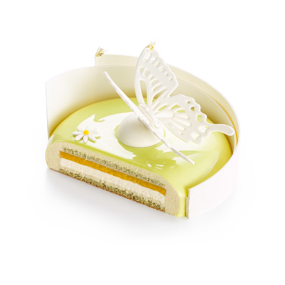 A refreshing cake with a mousse layer made from fresh mangoes, offering a light and sweet flavor, Secret Garden becomes even more intriguing with the combination of a pandan-infused sponge cake and a rich, creamy cream cheese layer. Its shimmering appearance, coated with an avocado-green mirror glaze and adorned with unique white chocolate butterfly wings, Secret Garden carries a message of romance and free-spiritedness.